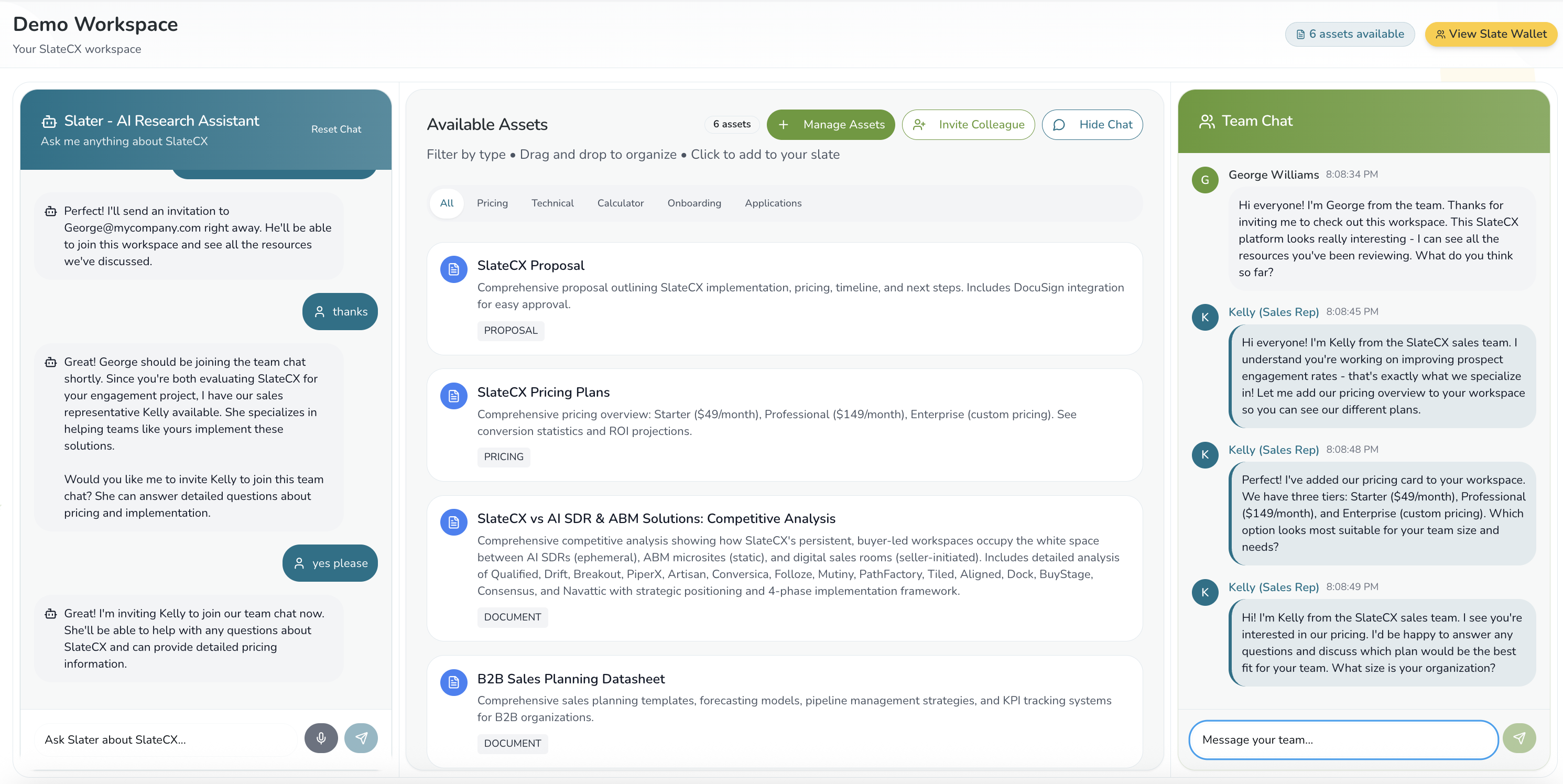 When prospects are actively engaged and ready for sales interaction, SlateCX automatically invites your sales rep to join the team chat at exactly the right moment. No more cold calls - your reps enter warm conversations with prospects who are already engaged.